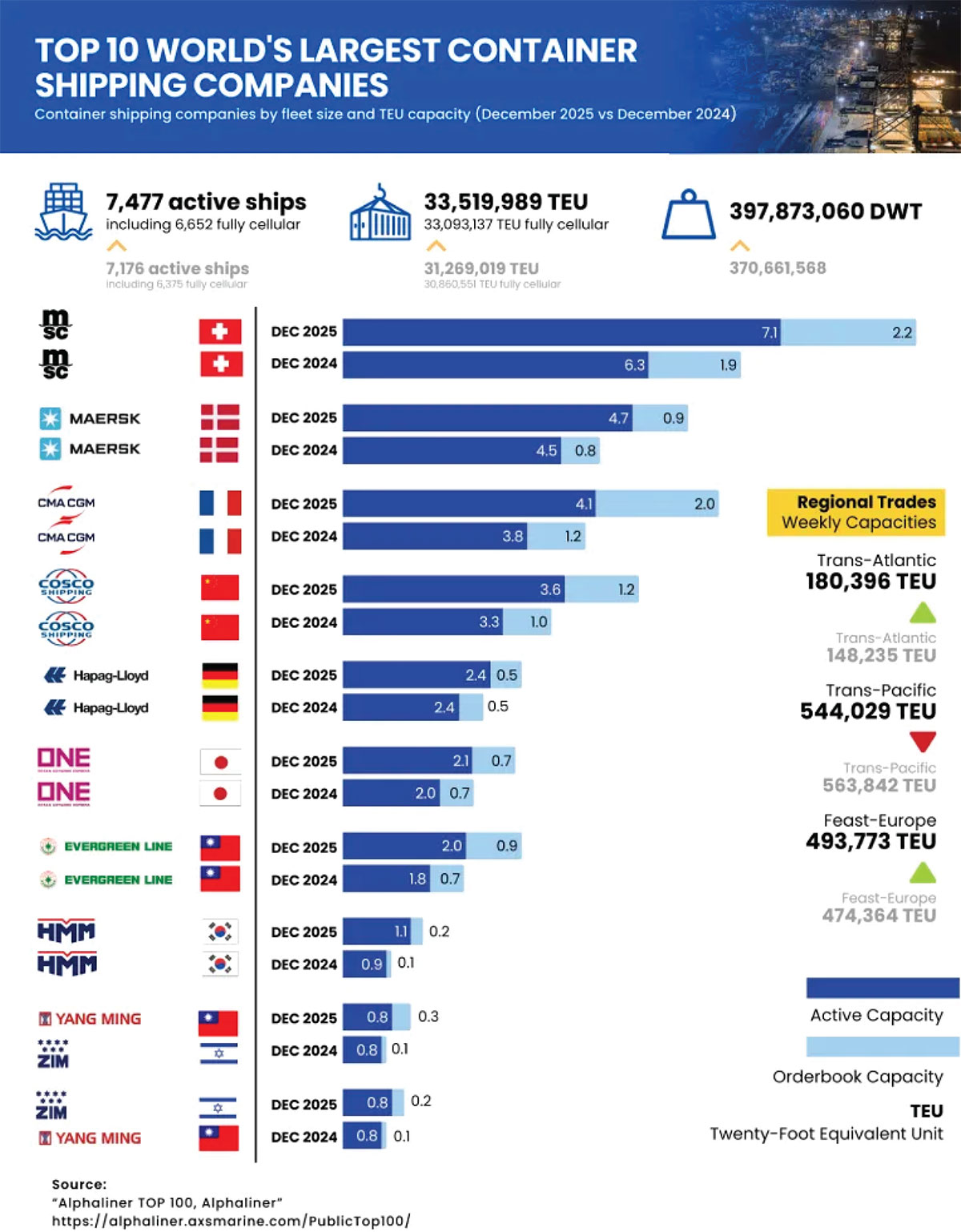 From December 2024 to December 2025, weekly trading capacities have also shifted noticeably. Trans-Atlantic and Feast–Europe services have seen an increase in capacity, reflecting stronger trade links and steady demand. Conversely, Trans-Pacific capacity has declined as carriers reallocate ships to other routes amid changing demand patterns and evolving geopolitical considerations.